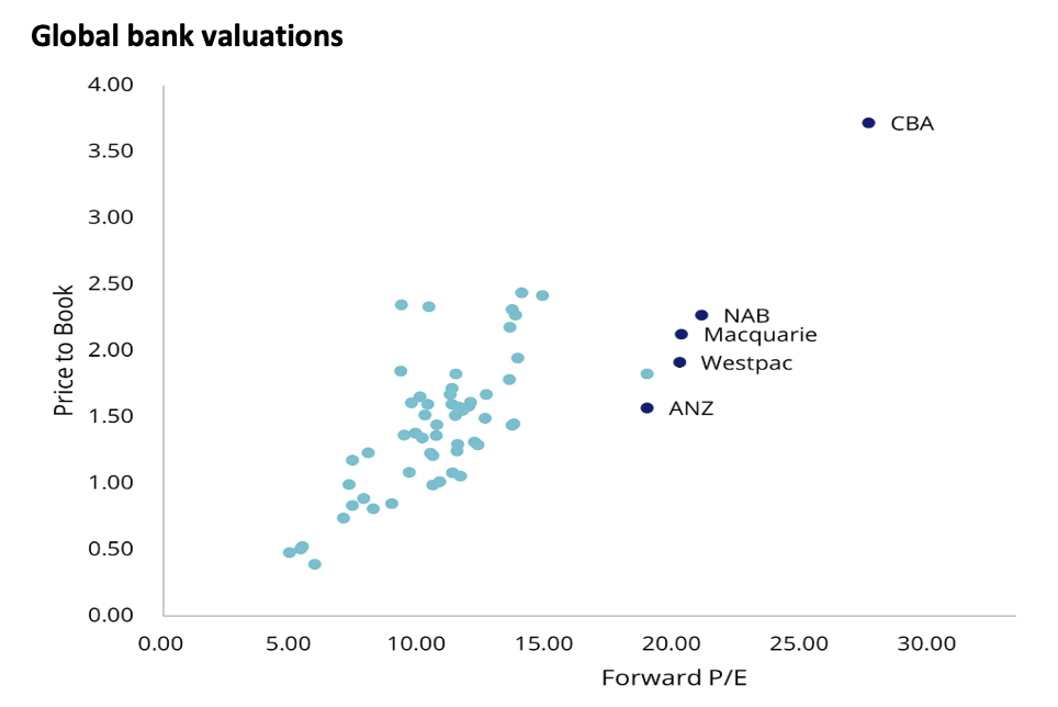 Soaring bank valuations have been a key driver of the share market rally over the past few years. The ASX 200 is trading at about 17.2 times forward earnings, way above its 15 year average of 14.8 times. But excluding the banks, the price/earnings ratio is lower at 16.5. The banks, particularly the Commonwealth Bank (CBA), remain too expensive for value funds and the profits outlook is too weak for growth funds. The chart below compares Australian bank valuations to those of other global banks.