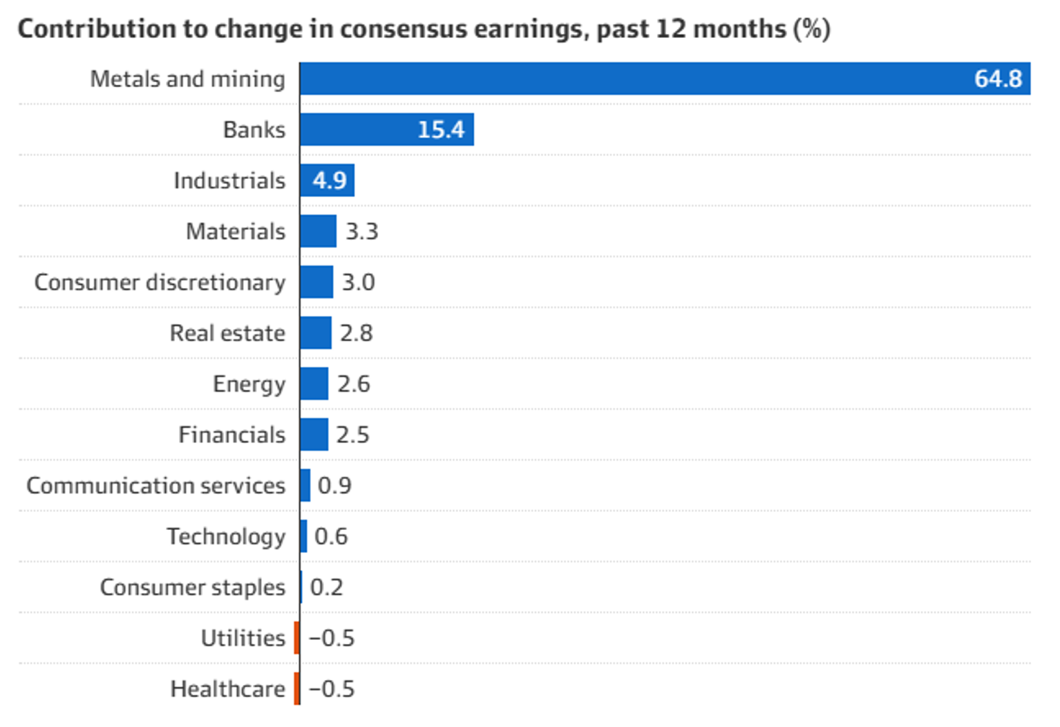 Resource stocks have accounted for a almost 65% of the growth in ASX 200 profit expectations over the past year (see chart below), due to rising prices of everything from gold and silver to copper and aluminium. Earnings for the materials sector are now expected to jump 34% in FY 2026 but this lofty projection will be tested from this month as mining companies release their quarterly updates.